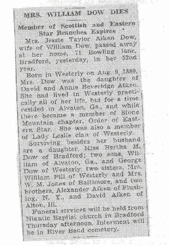 From Jessie's parent's death records, I can see that Jessie moved to Georgia to take care of her parents, who had retired there and then moved back to Westerly when they died. She lived at 71 Bowling Lane in Bradford. She was only 52 when she died.