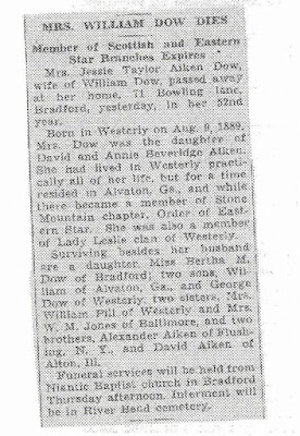 She died in Westerly, Rhode Island and is buried in River Bend Cemetery in the Dow plot. Growing up, I knew nothing about her except that somehow she was related to me through a woman that my dad called Freckles. Freckles turned out to be Bertha M. Dow, Jessie's youngest daughter who died, unmarried, and is buried without a headstone in the Dow plot at River Bend Cemetery in Westerly.