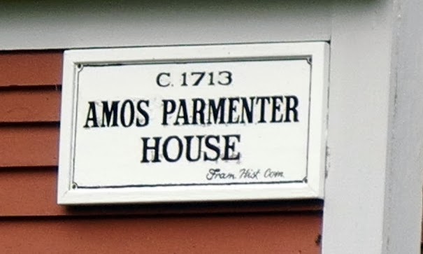 Using my telephoto zoom on my camera, I was sure I got a clear enough photo of the plaque. Upon arriving home, I used software to get close enough view to read the plaque. It was placed on this house by the Framingham Historical Society. Circa 1713 does seem to fit since many men built a house just before they married. Amos and Mercy married on 21 Dec 1715.